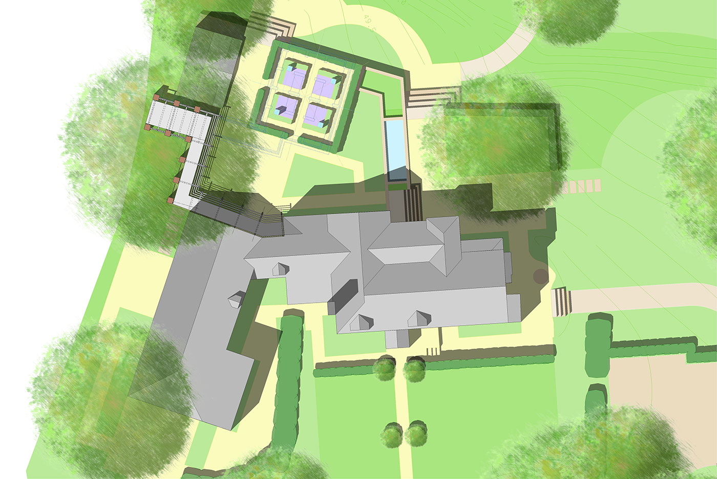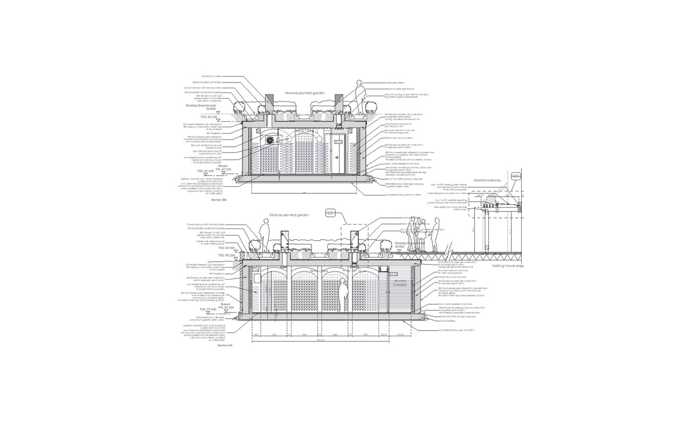 Extension to an existing Grade 2 listed house. Works comprising a 450 sq ft below ground wine cellar and linking pergola structure.