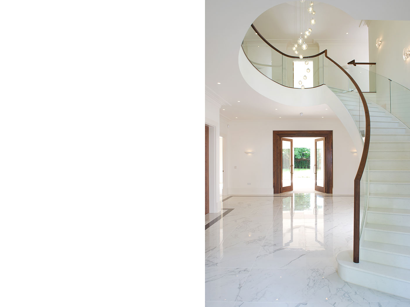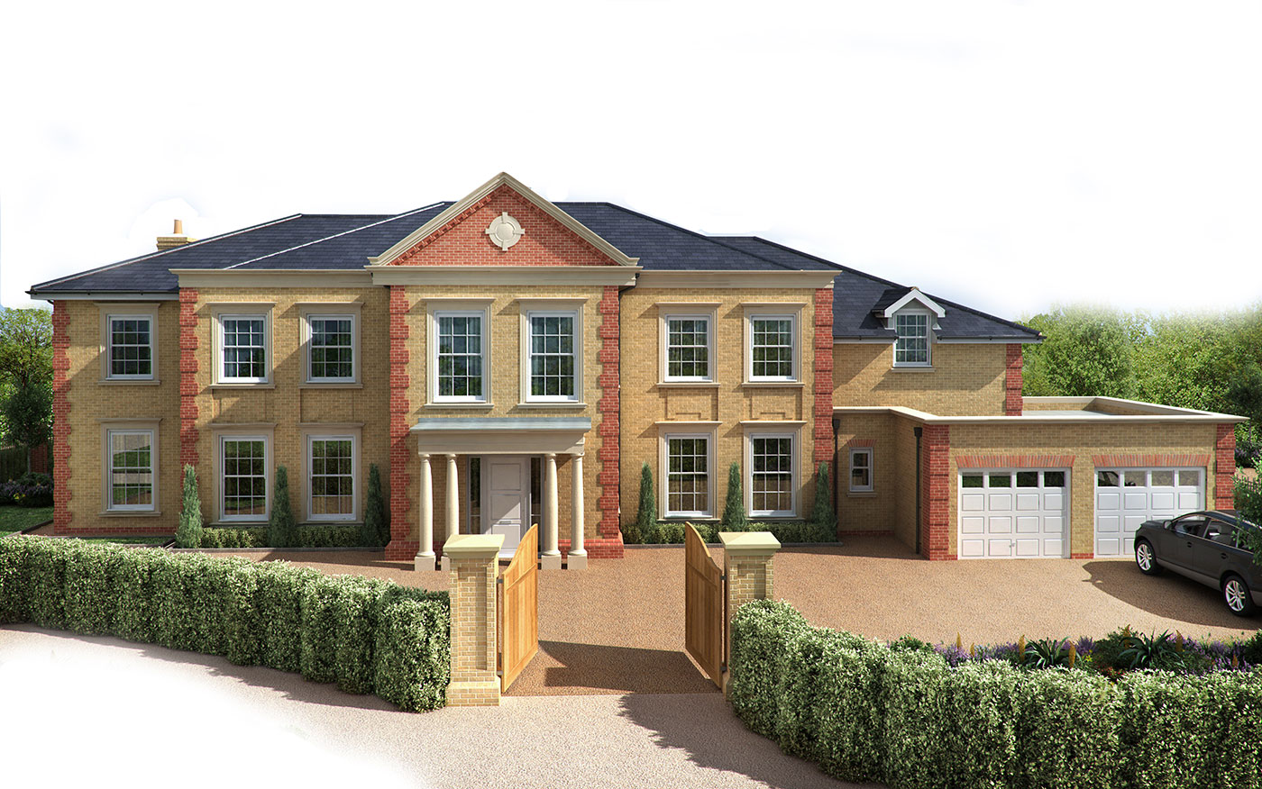 A large detached houses on 2 levels completed Aug 2013, the scheme evolved to its present form (7,800 sq ft) with our appointment, RIBA Stage A-F for a commercial developer. The classically designed external façades, contrasting with the internal layout provide an imposing development with strong emphasis on handmade quality kitchens / bathrooms with clean light spaces.